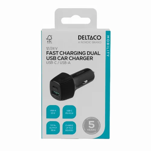 DELTACO USB car charger, 1x USB-C, PD 18 W, 1x USB-A, 18 W, total 36 W