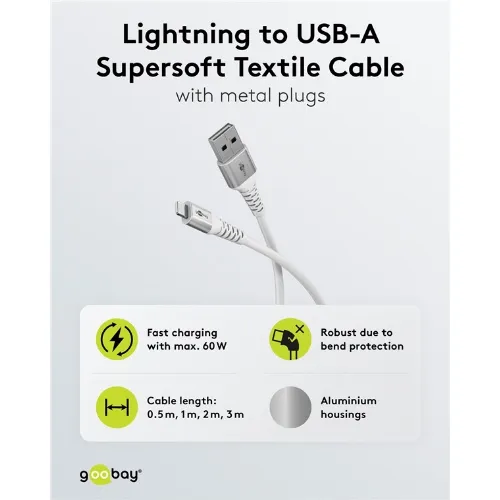 Goobay Lightning-USB-A supersoft textilkabel med metallkontakter, 1 m, vit MFi-certifierad, elegant och extra robust laddnings- och synkroniseringskabel för Apple iPhone/iPad (vit)