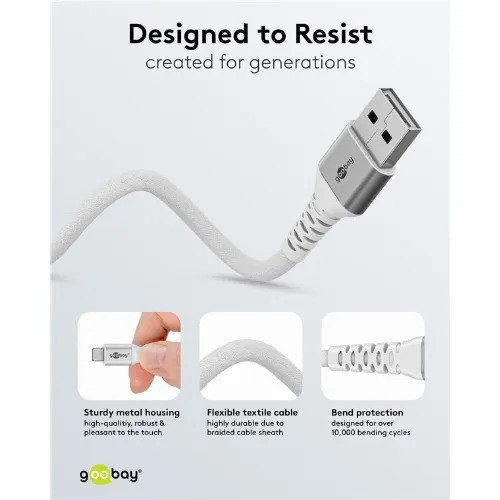 Goobay Lightning-USB-A supersoft textilkabel med metallkontakter, 3 m, vit MFi-certifierad, elegant och extra robust laddnings- och synkroniseringskabel för Apple iPhone/iPad (vit)