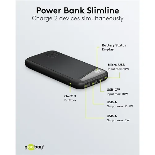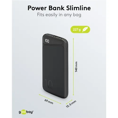 Goobay Powerbank Slimline 10.000 mAh Krachtige 10.000 mAh met een statusweergave