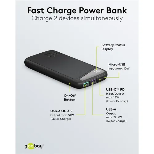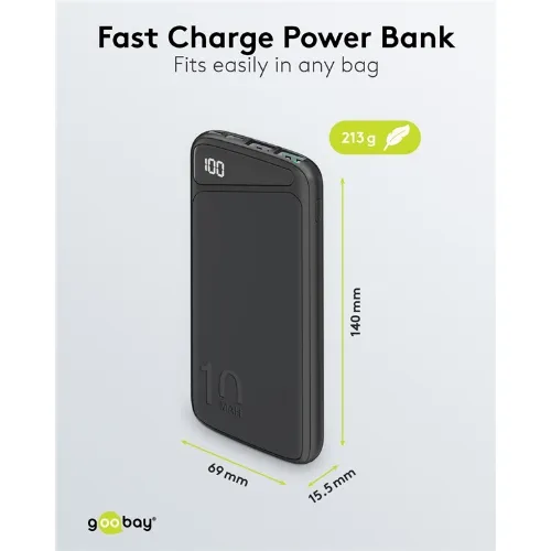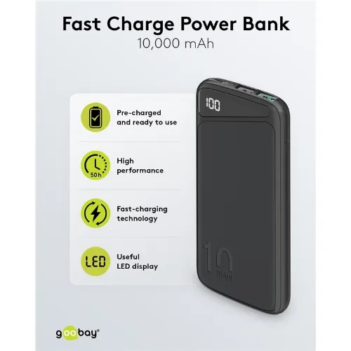 Goobay Snellaad Powerbank 10.000 mAh (USB-C™ PD, QC 3.0) Krachtige powerbank met statusweergave, compatibel met Quick Charge