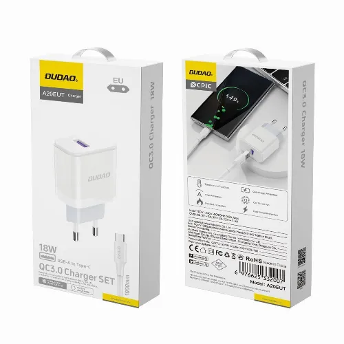 Dudao A20EU USB-A 18W mains charger - white + USB-A - USB-C cable