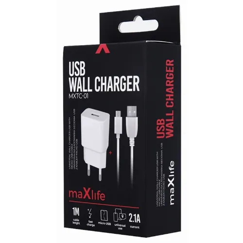Maxlife USB-snabbladdare + microUSB-kabel, MXTC-01, fast charge, vit (2,1A)