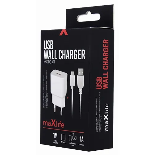 Maxlife väggladdare med USB-utgång, inklusive USB-C kabel, 1A, vit