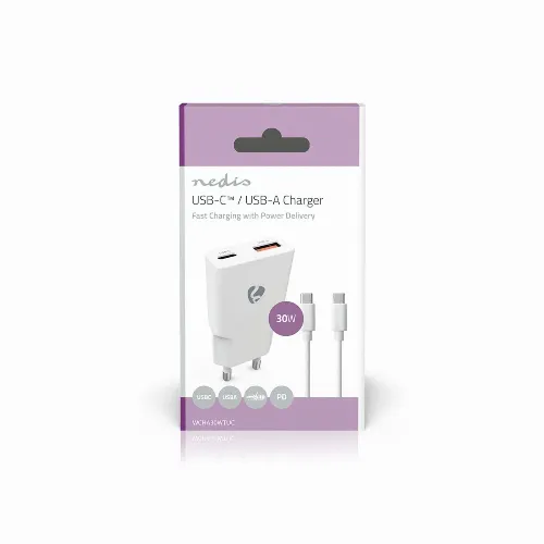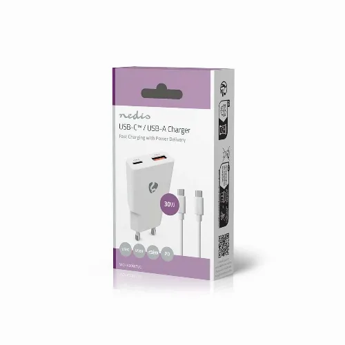 Nedis Oplader | 30 W | GaN | PD3.0 | 1.5 / 2.0 / 2.5 / 3.0 A | Outputs: 2 | USB-A / USB-C™ | USB-C™ (Los) Kabel | 1.50 m | Automatische Voltage Selectie | Wit