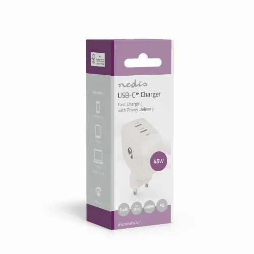 Nedis Oplader | 45 W | GaN | PD3.0 | 2.25 / 3.0 A | Outputs: 2 | 2x USB-C™ | Automatische Voltage Selectie | Wit