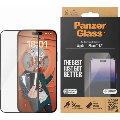 PanzerGlass Ultra-Wide Fit med Aligner -skärmskydd, iPhone 15 Plus